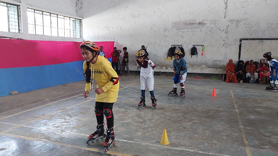 রোলার স্কেটিং প্রদর্শন করে কয়েকজন প্রশিক্ষণার্থী। ছবি: বাংলারচিঠিডটকম
