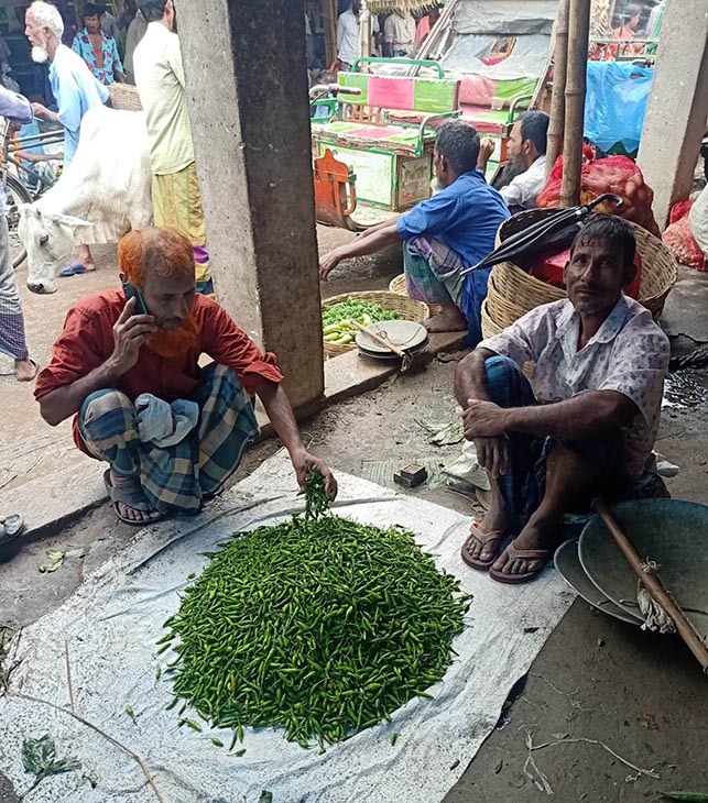 শহরের নয়আনী বাজারের খুচরা কাঁচামাল বিক্রেতা আসগর আলী বলেন, পাইকারি বাজার থেকে প্রতিপাল্লা কাঁচা মরিচ ১৮শ টাকা দিয়ে কিনে খুচরা পর্যায়ে প্রতি কেজি ৪শ টাকা বিক্রি করলেও তাদের পোষাচ্ছেনা। কারণ পাইকারি বাজারে মরিচ কেনার পর আড়ৎ জমা, কুলি খরচ আর পরিবহণ ভাড়া দিয়ে তাদের লাভের অংশ খুবই কম থাকে।