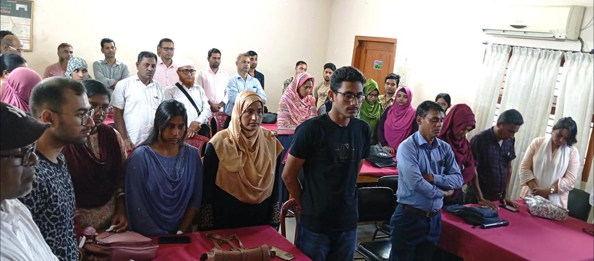 বৈষম্যবিরোধী ছাত্র আন্দোলন এবং দেশে চলমান বন্যায় নিহতদের স্মরণে দাঁড়িয়ে এক মিনিট নিরবতা পালন করা হয়।ছবি: বাংলারচিঠিডটকম