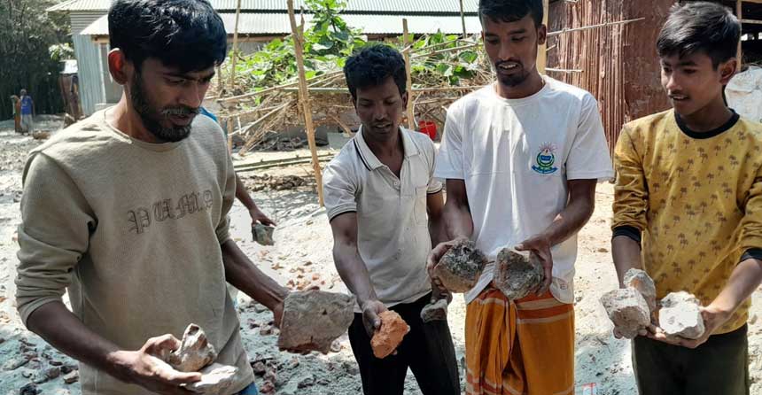 বকশীগঞ্জ : এলজিইডির রাস্তার কাজে নিম্নমানের ইট-খোয়া দেখান স্থানীয় গ্রামবাসী। ছবি : বাংলারচিঠিডটকম
