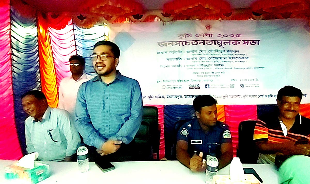 ইসলামপুর থেকে নিজস্ব প্রতিবেদক লিয়াকত হোসাইন লায়ন জানান, ইসলামপুরে ভূমি মেলা উদযাপন উপলক্ষে জনসচেতনতামূলক সভা অনুষ্ঠিত হয়েছে। ২৫ মে রবিবার উপজেলা ভূমি অফিসে এই সভা অনুষ্ঠিত হয়। সহকারী কমিশনার (ভূমি) রেজোয়ান ইফতেকারের সভাপতিত্বে অনুষ্ঠিত সভায় বক্তব্য রাখেন সভায় বক্তব্য রাখেন ইসলামপুর উপজেলা পরিষদের সাবেক চেয়ারম্যান নবী নেওয়াজ খান লোহানী বিপুল, ইসলামপুর থানার ওসি সাইফুল্লাহ সাইফ, জেলা বিএনপির বন ও পরিবেশ বিষয়ক সম্পাদক জয়নাল আবেদীন, ইসলামপুর প্রেসক্লাবের সাবেক সভাপতি ফিরোজ খান লোহানী, শিক্ষার্থী তাবাসসুম রৌজসি প্রমুখ। বক্তারা ভূমি ব্যবস্থাপনা অটোমেশন প্রকল্প, স্মার্ট ভূমিসেবা, স্মার্ট ভূমি রেকর্ড ও ম্যাপ সেবা নামজারি ব্যবস্থাসহ ভূমিসেবায় কেউ যাতে হয়রানি না হয় সংশ্লিষ্টদের প্রতি আহবান জানান।