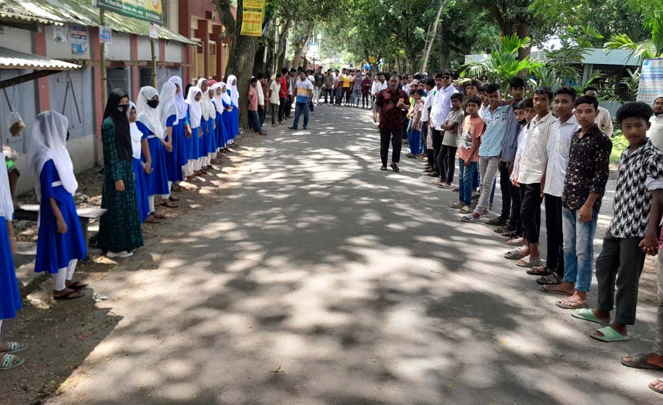 বকশীগঞ্জ : নগর মামুদ উচ্চ বিদ্যালয় প্রাঙ্গণে মানববন্ধন। ছবি : বাংলারচিঠিডটকম