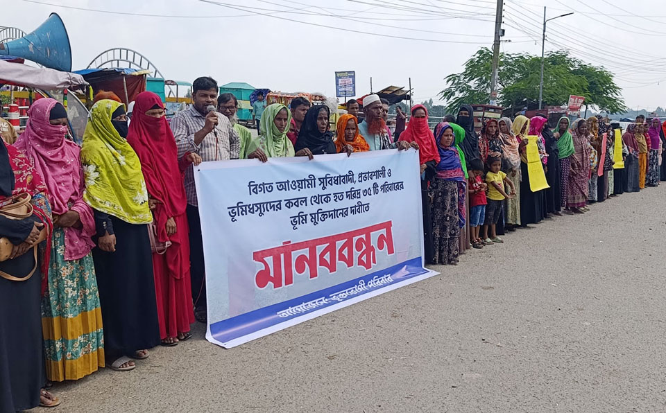 জামালপুরে আওয়ামী সুবিধাবাদী, প্রভাবশালী ও ভূমিদস্যুদের কবল থেকে ভূমি উদ্ধারের দাবিতে মানববন্ধন ও স্মারকলিপি পেশ করেছে ভুক্তভোগী কৃষকেরা। ১২ অক্টোবর, রবিবার দুপুরে জামালপুর শহরের ফৌজদারী মোড়ে ভূক্তভোগী ৩৫টি পরিবারের সদস্যরা এই কর্মসূচির আয়োজন করে।