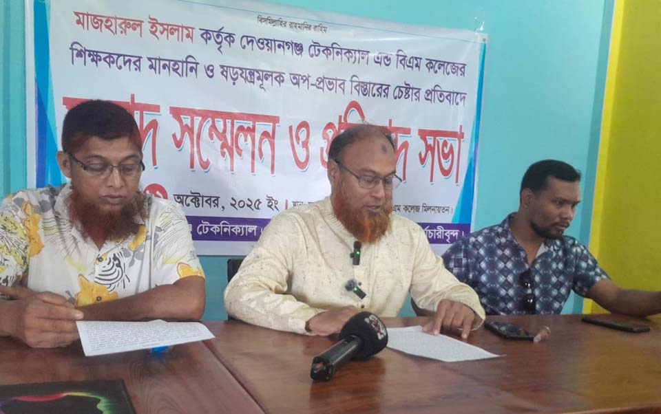 জামালপুরের দেওয়ানগঞ্জ উপজেলায় মাজহারুল ইসলামের অন্যায় অত্যাচার ও মিথ্যা অপপ্রচারের প্রতিবাদে সংবাদ সম্মেলন অনুষ্ঠিত হয়েছে। ১২ অক্টোবর, রবিবার সকালে টেকনিক্যাল ও বিএম কলেজ শিক্ষক-কর্মচারী ব্যানারে এই সংবাদ সন্মেলন অনুষ্ঠিত হয়।