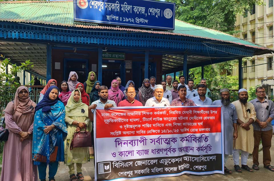 ঢাকা কলেজের শিক্ষক কর্মকর্তা, নিয়মিত মেধাবী শিক্ষার্থীদের উপর দুষ্কৃতিকারীদের হামলা, টিচার্স লাউঞ্জ ভাংচুরের ঘটনায় দোষীদের আইনের আওতায় এনে দ্রুত গ্রেপ্তার দাবি এবং শিক্ষা ক্যাডারের স্বার্থ সংশ্লিষ্ট অন্যান্য দাবি প্রেক্ষিতে কালোব্যাজ ধারণ করে অবস্থান কর্মসূচির মাধ্যমে দিনব্যাপী কর্মবিরতি পালন করেছে শেরপুরের কলেজ শিক্ষকেরা।