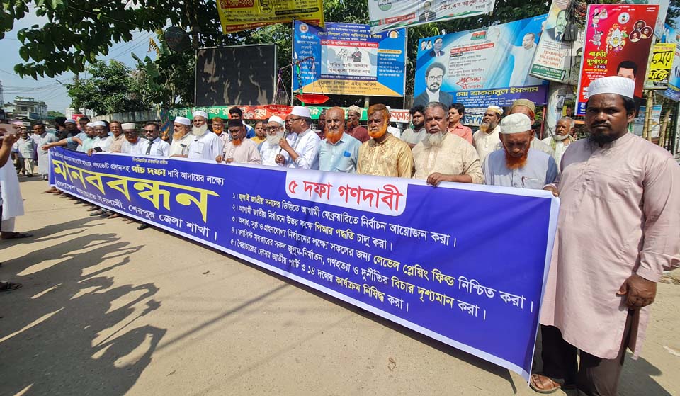 জুলাই জাতীয় সনদের বাস্তবায়ন আদেশের মাধ্যমে গণভোট প্রদানসহ পাঁচ দফা দাবি আদায়ের লক্ষ্যে শেরপুর জেলা জামায়াতে ইসলামীর উদ্যোগে এক মানববন্ধন অনুষ্ঠিত হয়েছে। ১৫ অক্টোবর, বুধবার সকালে শেরপুর আদালত, পুলিশ সুপার এবং জেলা প্রশাসক কার্যালয়ের মূল ফটকের সামনে তারা এই কর্মসূচি পালন করেন।