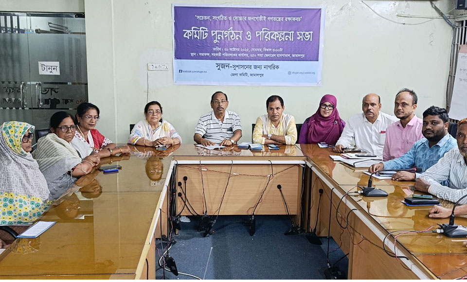 পরে সভায় উপস্থিত সকলের সম্মতিতে সুজন জামালপুর জেলা কমিটি গঠন করা হয়। সভাপতি পদে অজয় কুমার পাল ও সম্পাদক পদে মোহাম্মদ সাজ্জাদ হুসেনকে নির্বাচিত করা হয়। কমিটির অন্যান্যরা হলেন- সহ-সভাপতি যথাক্রমে শামীমা খান, আইনজীবী ইউসুফ আলী, মশিউর আলম বাবলু, সহ-সম্পাদক যথাক্রমে মোহাম্মদ রাসেল মিয়া, ইমরান আলম রোজ, সাংগঠনিক সম্পাদক আসমাউল আসিফ, কোষাধ্যক্ষ ফাতেমা নার্গিস, প্রচার সম্পাদক মাহবুব রহমান, দপ্তর সম্পাদক সাজেদা পারভীন ঝিনুক, নির্বাহী সদস্য যথাক্রমে বিবেকানন্দ কর্মকার, দেওয়ান আব্দুল মালেক, জাবেদ আলী, সোহানুর রহমান, সাইফুল ইসলাম বিপ্লব, রেনু খানম, পারভেজ সরকার, মৌসুমী কিবরিয়া।