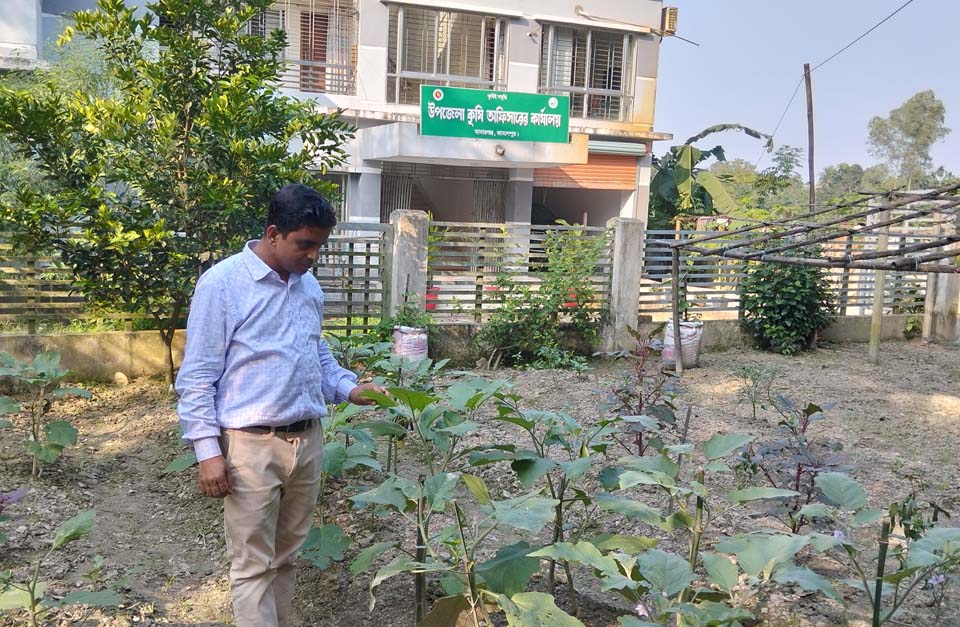 কৃষি কর্মকর্তার কার্যালয় চত্বরে শতাধিক বস্তায় বিভিন্ন সবজি ও ৭০০ বস্তায় আদা চাষ করা হয়েছে। পাশাপাশি লাগানো হয়েছে মাল্টা, পেঁপে, অরহর, পেয়ারা, করমচা, বরই, ডালিম, লেবু, সজিনা ও কলাসহ নানা ফলের গাছ। পেশাগত দায়িত্ব পালনের পাশাপাশি অফিসের অন্যান্য সদস্যদের নিয়ে সবজি বাগান পরিচর্যা করেন কৃষি কর্মকর্তা। এসব ফসলেই কৃষি অফিসের কর্মকর্তা-কর্মচারীদের সবজির চাহিদা মিটছে, অতিরিক্ত ফসল দেওয়া হচ্ছে সেবাপ্রার্থীদের।