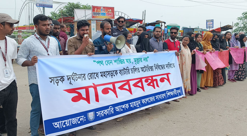 ঘন্টাব্যাপী মানববন্ধনে বক্তব্য রাখেন শিক্ষার্থী নাজমুল, নাসিব, তুলি, আজিজুর, রাব্বি প্রমুখ। এ সময় শিক্ষার্থী নাজমুল বলেন, ২৭ অক্টোবর, সোমবার সড়ক দুর্ঘটনায় সরকারি আশেক মাহমুদ কলেজের দু’জন শিক্ষার্থী আরিফা আক্তার পলি ও সুমাইয়া জামান সিথি নিহত হয়েছেন। মহাসড়কে সকল অবৈধ ও ব্যাটারিচালিত অটোরিকশা চলাচল বন্ধ করতে হবে।
