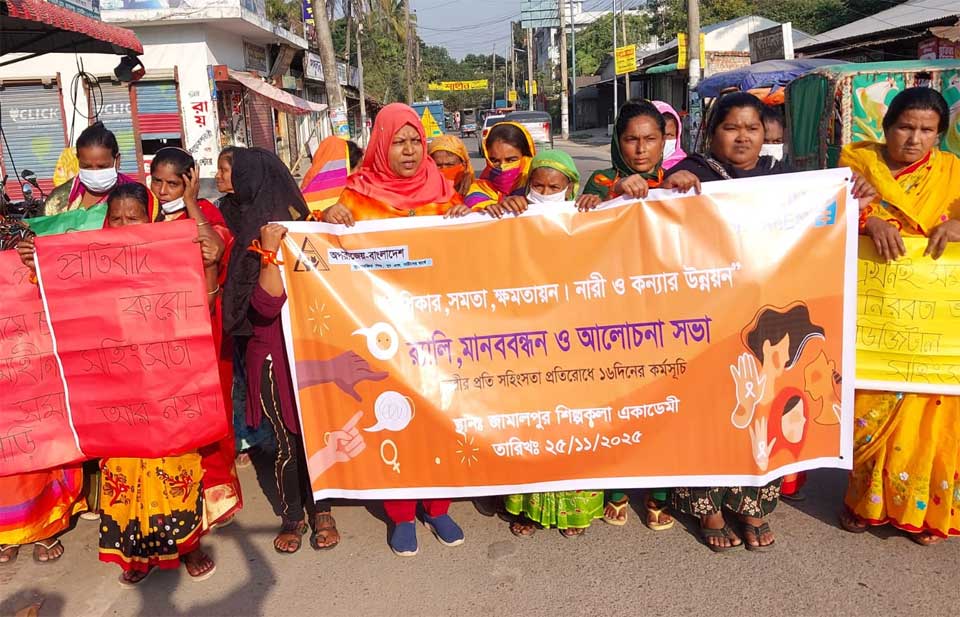 দাতা সংস্থা ইউএন-উইমেন এর অর্থায়নে অপরাজেয় বাংলাদেশের সংযোগ প্রকল্পের উদ্যোগে ২৫ নভেম্বর আন্তর্জাতিক নারী নির্যাতন প্রতিরোধ দিবসে আলোচনা সভা ও বর্ণাঢ্য শোভাযাত্রা কর্মসূচি পালন করা হয়েছে। জামালপুর শহরের রানীগঞ্জ যৌনপল্লী সংলগ্ন প্রকল্পের কার্যালয়ের সার্বিক ব্যবস্থাপনায় নারীর প্রতি সহিংসতা প্রতিরোধে ১৬ দিনের কর্মসূচির অংশ হিসাবে এই দিবসটিও পালন করা হয়।
