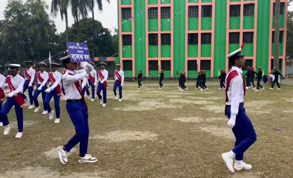 জামালপুর : সুসজ্জিত শিশুরা অতিথিদের সামনে প্রদর্শন করে কুচকাওয়াজ। ছবি : বাংলারচিঠিডটকম