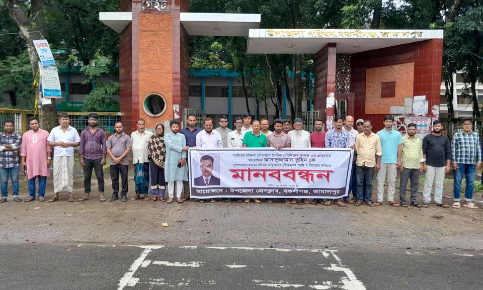 সাংবাদিক তুহিন হত্যা : জড়িতদের শাস্তির দাবিতে বকশীগঞ্জে মানববন্ধন