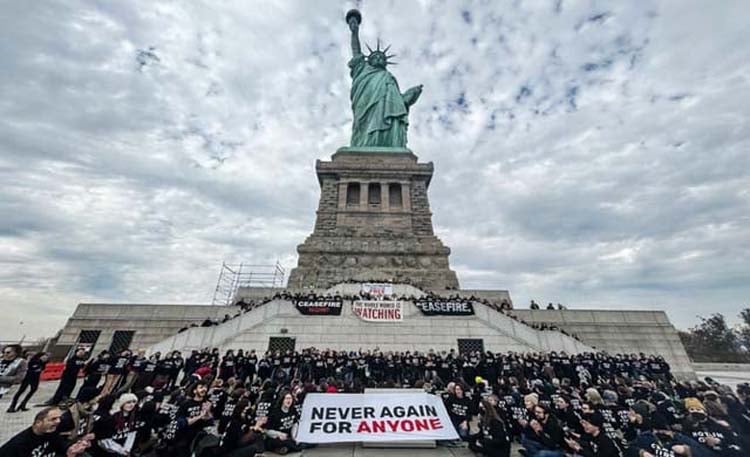গাজায় যুদ্ধবিরতির দাবিতে ‘স্ট্যাচু অফ লিবার্টি’ দখল করেছে ইহুদিরা