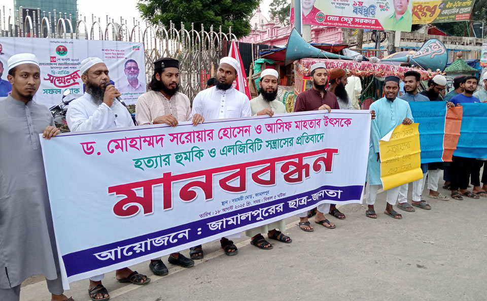 ড. মোহাম্মদ সরোয়ার হোসেন ও আসিফ মাহতাব উৎসকে হত্যার হুমকি ও এলজিবিটি (সমাকামিতা) সন্ত্রাসের প্রতিবাদে জামালপুরে মানববন্ধন করেছে ছাত্র-জনতা। ১৮