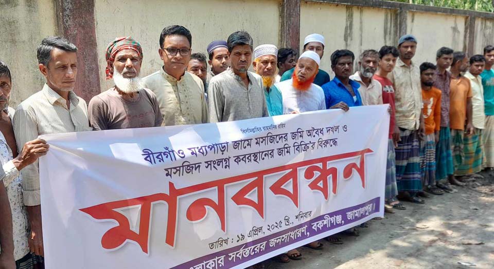 জামালপুরের বকশীগঞ্জ উপজেলায় মসজিদের জমি অবৈধভাবে দখল করে দোকানঘর নির্মাণ ও কবরস্থানের জমি বিক্রির প্রতিবাদে মানববন্ধন অনুষ্ঠিত হয়েছে। ১৯ এপ্রিল