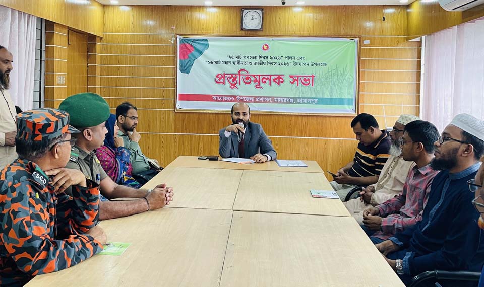 জামালপুরের মাদারগঞ্জ উপজেলায় ২৫ মার্চ গণহত্যা দিবস এবং ২৬ মার্চ মহান স্বাধীনতা ও জাতীয় দিবস-২০২৬ উদযাপনের প্রস্তুতি সভা অনুষ্ঠিত হয়েছে।